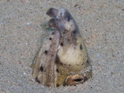 白い砂地では、ネコ目のミナミホタテウミヘビやモンダルマカレイの親子、ナマコに