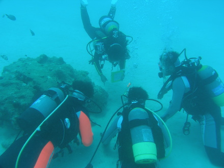 イロイロありましたがみんなで集合して記念撮影ができました。大雨でちょっぴり透明度が・・・。