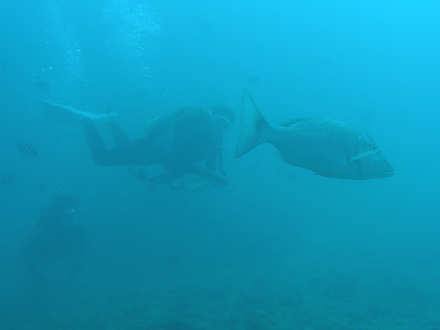 ドロップオフの上を見上げるとゆりこさんが空を飛んでいました!初ファンダイビングだけど上手ですね。