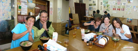 たっぷり2本潜った後は、熱々の沖縄そばをみんなでペロリです。アーサーそばがオススメですよ。