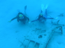 しばらく移動していると泳いでいるカメと休憩中のアオウミガメを発見。みんなで記念撮影なのだ。