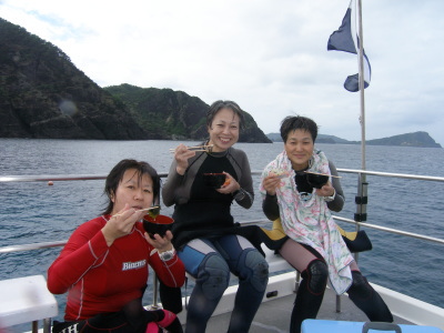たっぷり潜ったらお腹がペコリ!ケラマ諸島を眺めながら暖かいみそ汁は最高。キャプテンご馳走様!